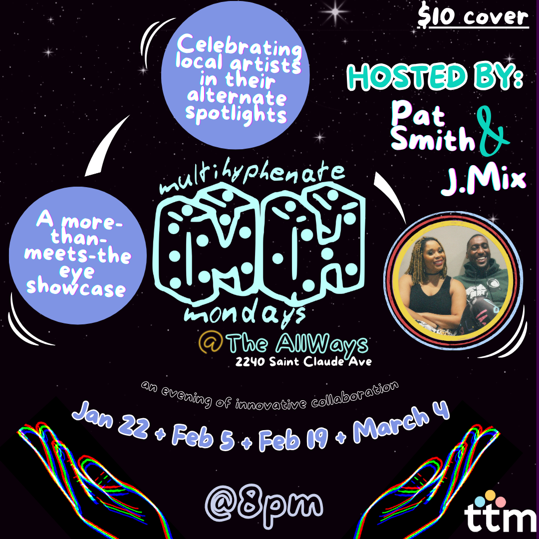 “Multi-Hyphenate Mondays” hosted by Pat Smith & J.Mix, celebrates New Orleans artists lesser-known talents. Oftentimes, artists aren’t given the time and space to share talents that they don’t monetize off of. This show gives them a chance to do that with a welcoming audience who roots them on for stepping out of their comfort-zone. MHM is the “sandbox” gathering for artists and creatives.
